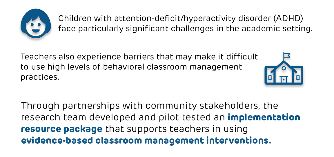 This project seeks to address knowledge gaps on effective approaches to support teacher use of evidence-based behavioral interventions for students with symptoms of ADHD in urban schools. Through partnerships with community stakeholders, the research team developed and pilot tested an implementation resource package that supports teacher use of evidence-based classroom management interventions. In providing this resource for educators, our goal is to enhance outcomes for children with ADHD.
