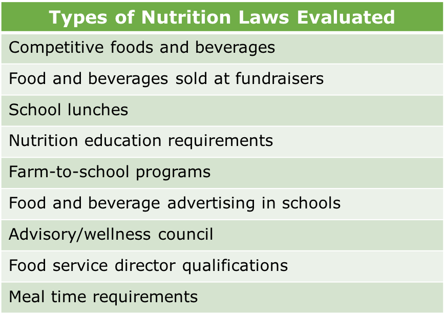 Children spend more time at school than any other location outside of the home. That’s why addressing the school environment is critical to reversing childhood obesity, which remains a serious public health problem with 17% of school age children obese. To combat this problem, many local, state, and federal agencies have enacted policies to improve school nutrition standards. The 2010 federal Healthy, Hunger Free Kids Act gave USDA the authority to set nutritional standards for foods sold in schools, and several states had already enacted laws requiring higher school nutrition standards.