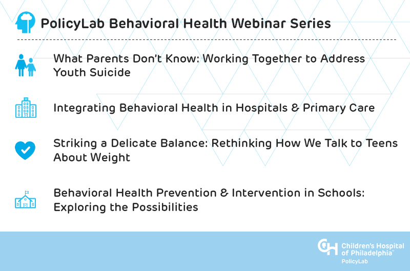 Recognizing this opportunity and the importance of this topic, we’re partnering with Children’s Hospital of Philadelphia’s Department of Child and Adolescent Psychiatry and Behavioral Sciences to launch a fifth PolicyLab portfolio later this year focused exclusively on behavioral health. Behavioral health has always been a critical part of our work here at PolicyLab—it’s the only topic that currently spans all four thematic research portfolios—and has continued to take shape as new behavioral health experts have joined our team. The addition of this portfolio will allow a multitude of researchers to look across the spectrum of mental and behavioral health and develop collaborations to enhance and augment this important work.